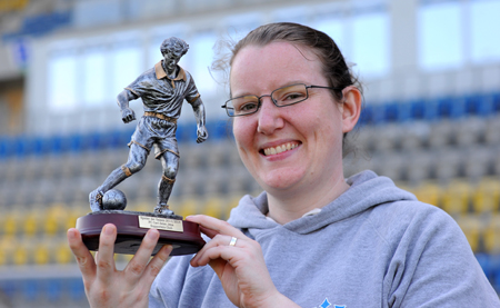 Pressesprecherin Maja Ressin mit dem Pokal für den Spieler der Saison