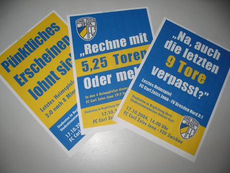 Kampagnen wie die Aktion „Volle Hütte gegen Dynamo“, als mit 12.000 Zuschauern ein Nachwenderekord im Ernst-Abbe-Sportfeld aufgestellt werden konnte haben hier ihre Heimat.